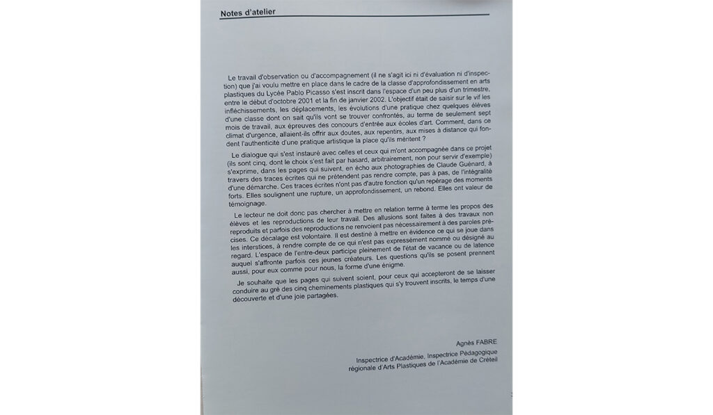 Avant d’intégrer l’École d’art de Cergy, j’ai préparé les concours d’entrée au sein de la Classe d’Approfondissement d’Arts Plastiques du lycée Pablo Picasso à Fontenay-sous-Bois (CAAP), coordonnée par Charles Galissot. Cette année-là, j’ai eu la chance de faire partie des cinq étudiants dont la démarche naissante a été suivie par Agnès Fabre, alors inspectrice pédagogique régionale d’Arts plastiques de l’académie de Créteil. Ce travail de suivi, mené sur quatre mois, a été retranscrit dans le catalogue de l’exposition de la promotion 2002.