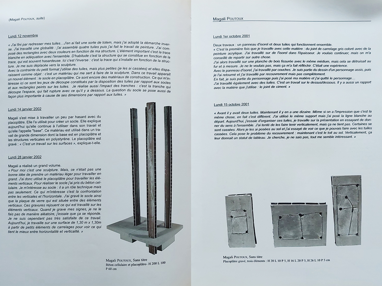 Avant d’intégrer l’École d’art de Cergy, j’ai préparé les concours d’entrée au sein de la Classe d’Approfondissement d’Arts Plastiques du lycée Pablo Picasso à Fontenay-sous-Bois (CAAP), coordonnée par Charles Galissot. Cette année-là, j’ai eu la chance de faire partie des cinq étudiants dont la démarche naissante a été suivie par Agnès Fabre, alors inspectrice pédagogique régionale d’Arts plastiques de l’académie de Créteil. Ce travail de suivi, mené sur quatre mois, a été retranscrit dans le catalogue de l’exposition de la promotion 2002.