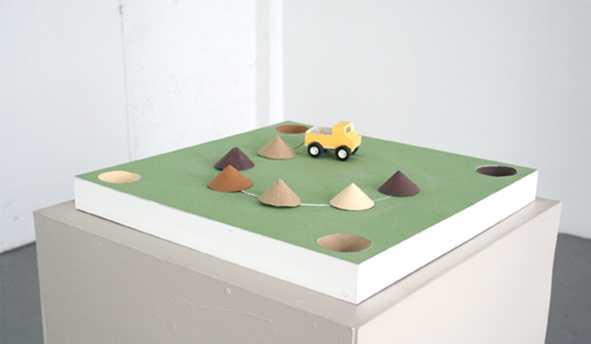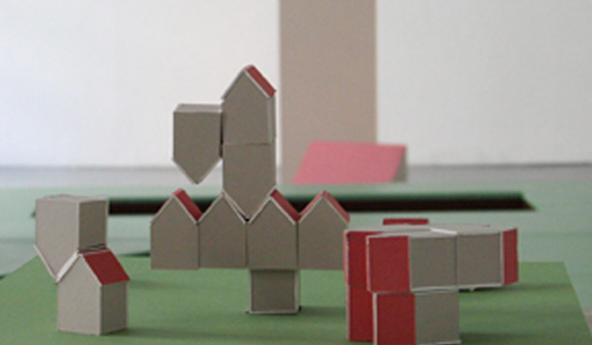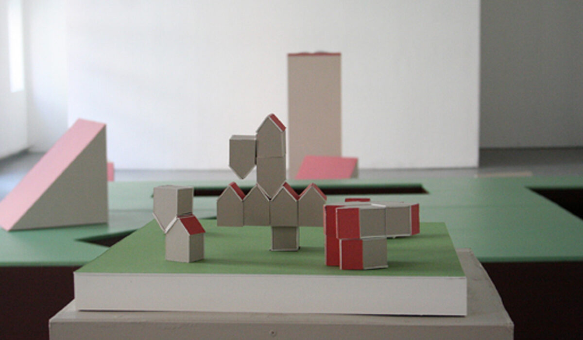 Tangram Sculpture évolutive bois et peinture 300x250x50cm 2007 Tangram est le socle de mon projet de diplôme. Cette sculpture représente un extrait de sol, codifié par la couleur : le dessus peint en vert, les faces latérales en marron. L’installation évoque un jeu de construction pour enfant dont l’échelle a été largement agrandie, où chaque élément peut être déplacé et réassemblé, transformant l’espace en un terrain de jeu sculptural. Le socle laisse apparaître des formes en creux, qui accueillent des modules. Assemblés, ces modules composent une maison cubique grise, surmontée de deux pans de toit rouges. Au premier regard, lorsque le jury entre dans la salle, le socle apparaît comme une surface plane. La scénographie du diplôme fonctionne comme une performance : à chaque passage du jury dans une autre salle pour visionner des vidéos, des assistants recomposent la sculpture. Les volumes deviennent alors des socles pour présenter d’autres projets, et les creux se révèlent dans le socle principal. Cette mise en scène crée un effet de surprise et accompagne le jury dans la découverte des différentes facettes de ma pratique et des différentes échelles de mon travail : maquettes, livres, dessins, installations… Tangram devient ainsi à la fois socle, […]