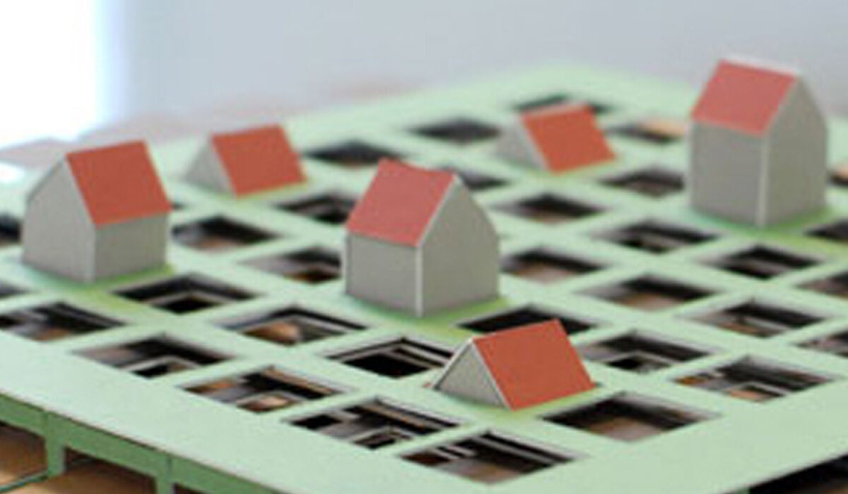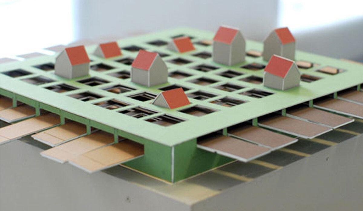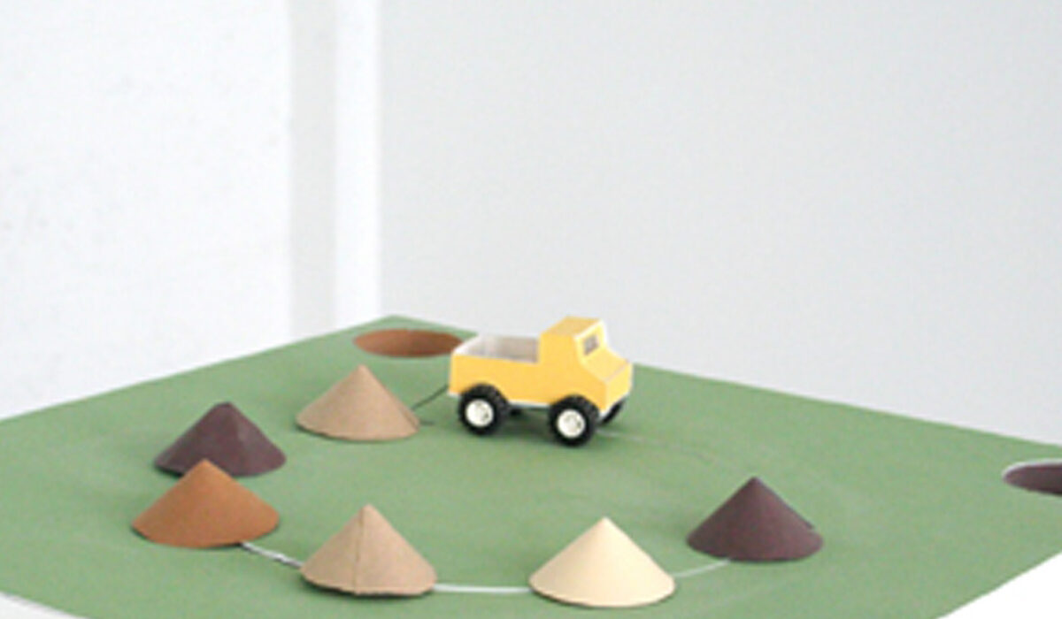 Pièges / Trou aimanté / 6 tas 4 trous cartons contrecollés canson 42x44X5cm Archives papiers numérisés 2006 Ces maquettes interrogent, sous la forme du jeu, le rapport entre l’habitat et le sol. Elles explorent la manière dont l’architecture façonne notre relation à la terre. Elle peut nous enfouir, comme dans la maquette Pièges, où les maisons s’enfoncent sous terre lorsque l’on active les languettes. Elle peut aussi nous élever bien au-dessus du niveau naturel du sol, comme dans Le trou aimanté, qui invite le spectateur à construire un empilement de maisons suspendues, accroché dans un simple trou au centre du plateau. Enfin, 6 tas et 4 trous pose la question de la terre excavée, de ces prélèvements qui reconfigurent artificiellement nos paysages et en redessinent les reliefs.