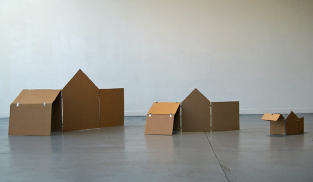 Les cabanes pliables 6 maisons en cartons de 20cm de hauteur à 120 cm. Cartons, charnières 2011 L’installation questionne notre rapport à l’habitat et au besoin d’habiter. Fidèle à sa démarche, l’artiste puise dans l’univers de l’enfance pour en déplacer les codes : la cabane, forme primitive de l’architecture, convoque le jeu, la cachette, l’autoconstruction et l’idée d’un « coin » à soi, intime et protecteur.